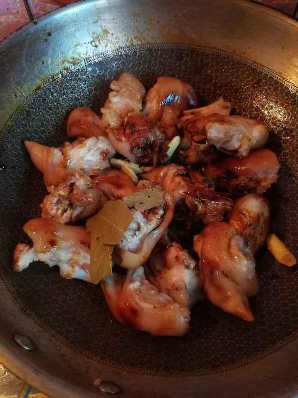 5. 红烧:将炖煮好的猪蹄捞出,沥干水分,放入锅中,加入适量的生抽、老抽、冰糖等调料,翻炒均匀,直至色泽红亮。